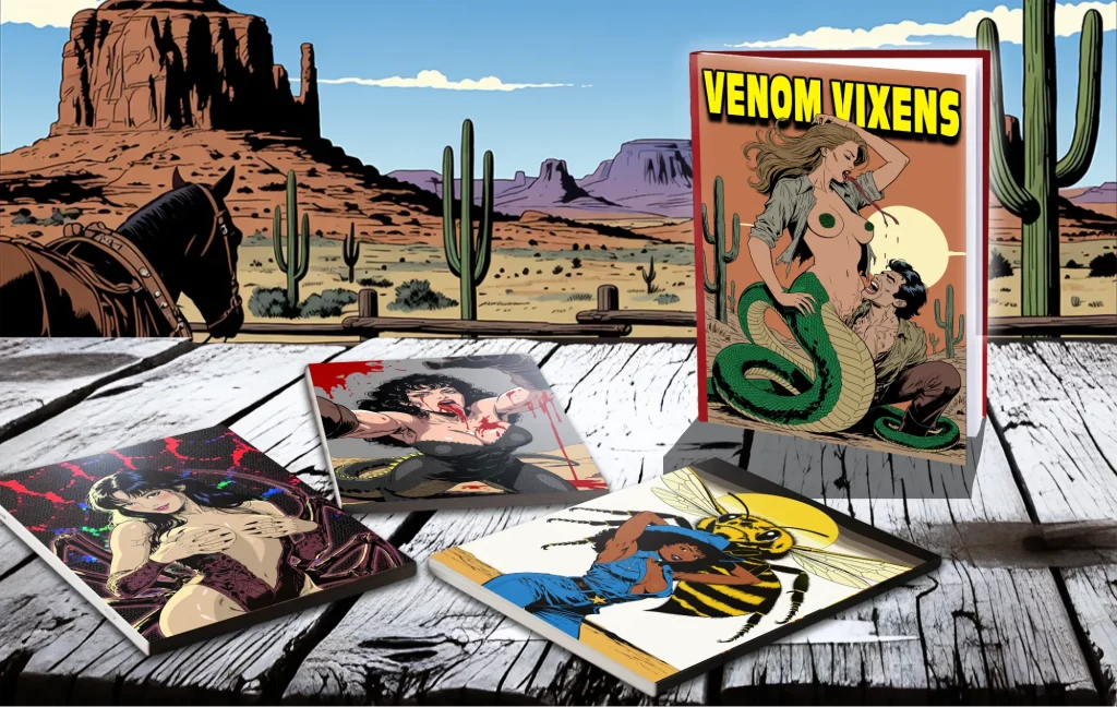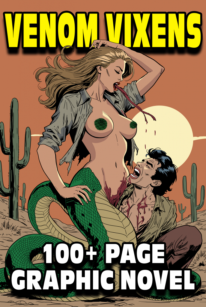 High on victory and the thrill of the score, the girls pass the bottle around, each taking a long, greedy pull of the sweet-burning liquor. What starts as a warm buzz explodes into something wilder; their bodies shift and surge with dark pleasure, skin turning to scales, tails curling out, silk spinning from fingertips, legs multiplying, claws thickening. Reborn as stunning venom hybrids, they tumble into a heated, tangled celebration right there on piles of gold, riding waves of ecstasy as their new forms lock into place. By sunrise, the Venom Vixens step off that train as unstoppable predators—beautiful, dangerous, and hungry to own the whole damn frontier with every coil, sting, and kiss