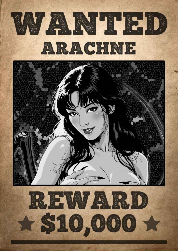 Smooth porcelain skin marked in black webs, eight long spider legs from her back for climbing or pinning, silk shooting from her wrists and lower back. Those red eyes miss nothing.
